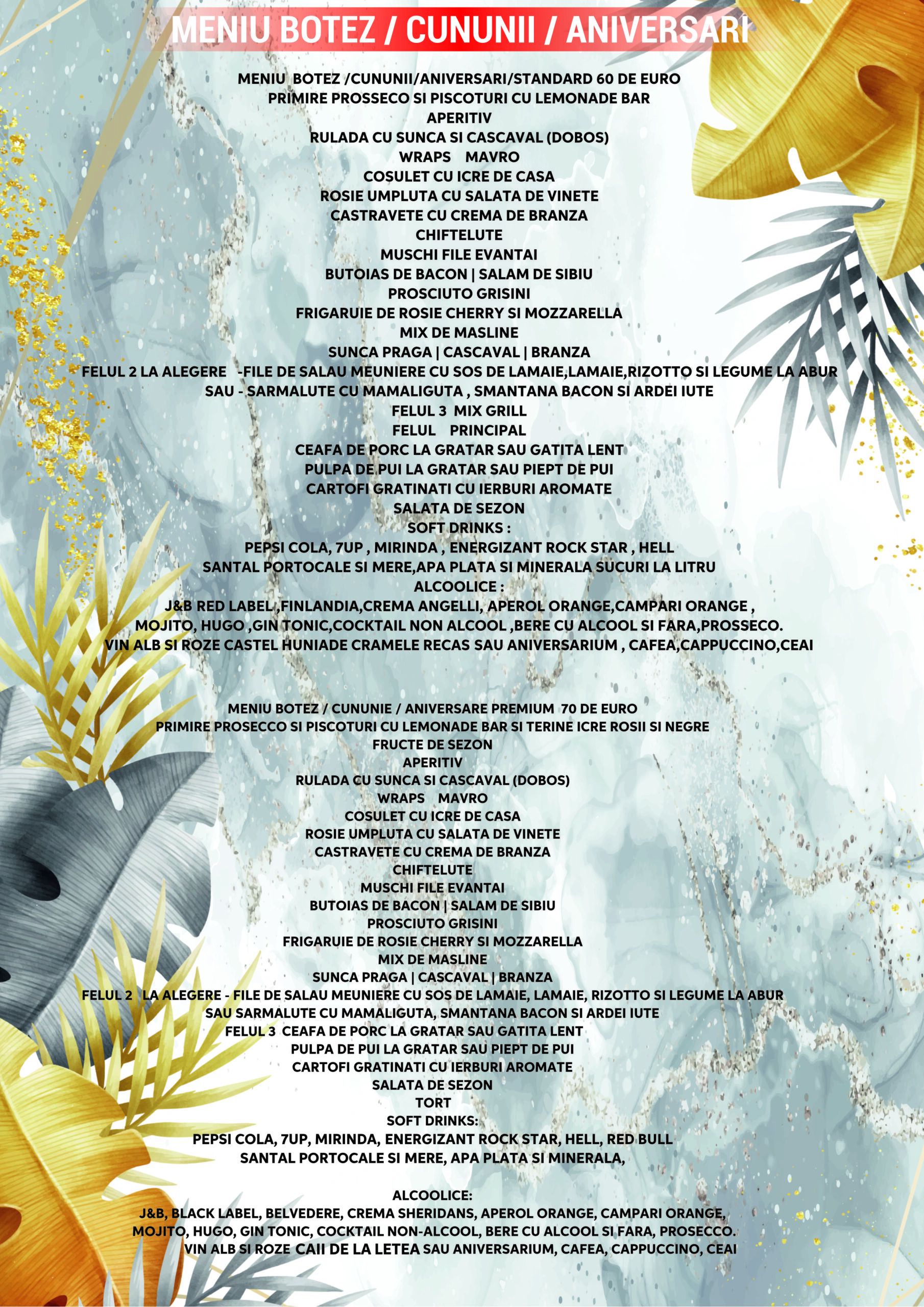 NON-ALCOOLICE: Cola, Fanta, Sprite, Apa plata, Apa minerala(la litru) , Santal, Mere, Portocale, Energizant, Scheppes Tonic, Cafea, Ceai, Cappuccino